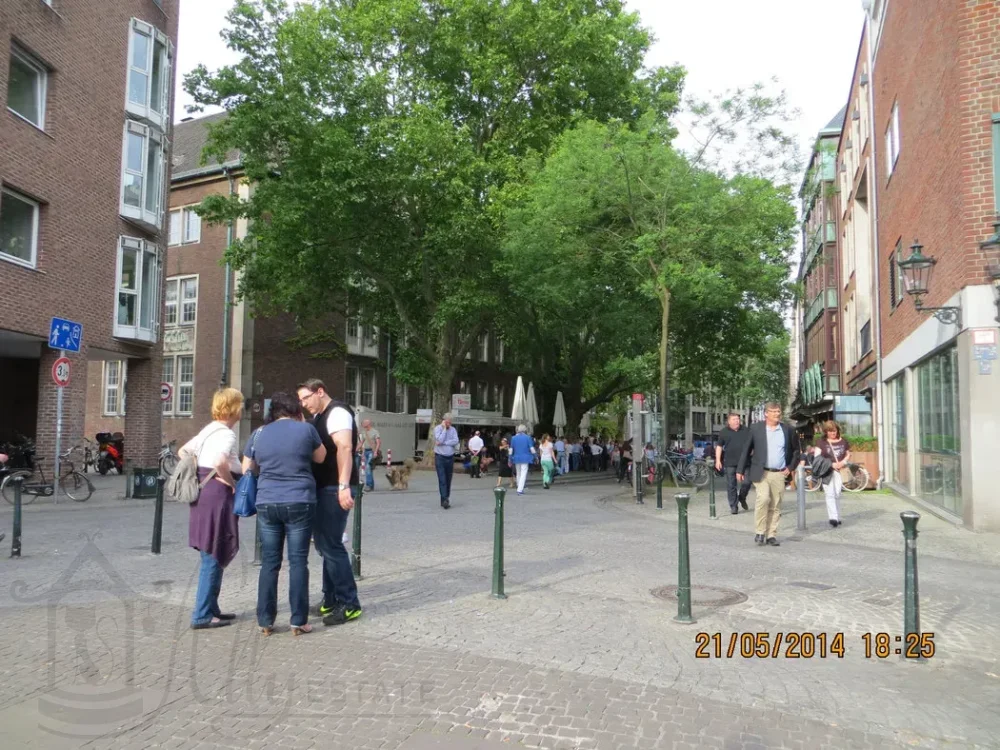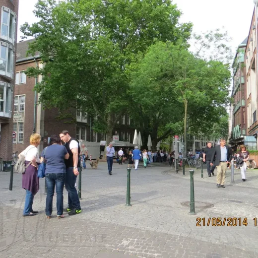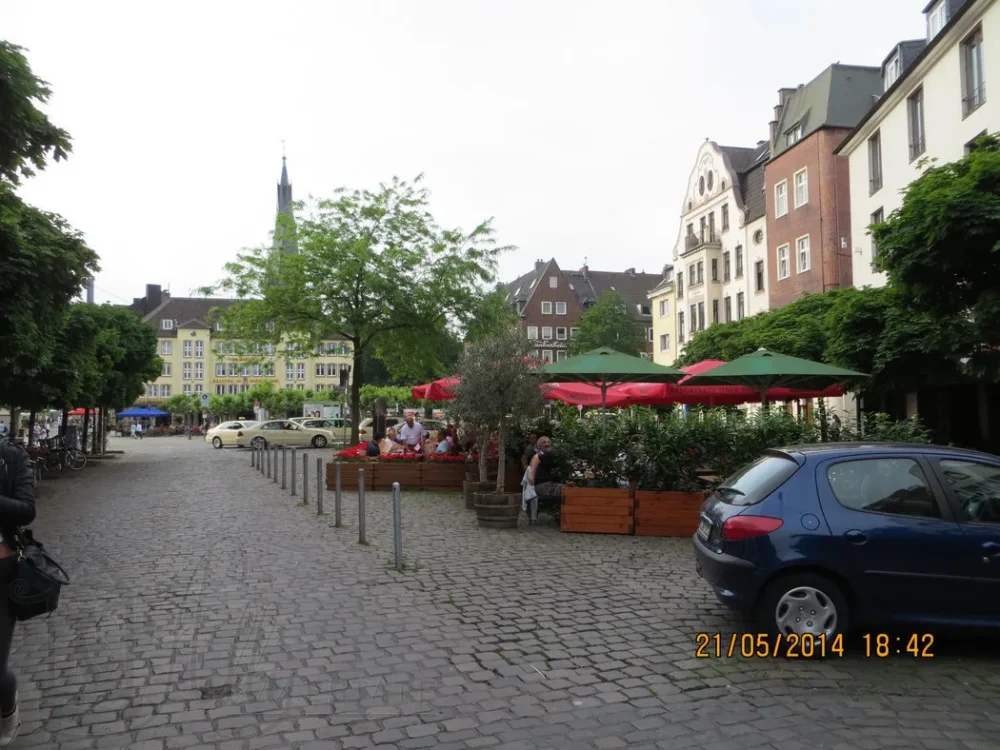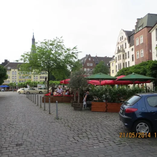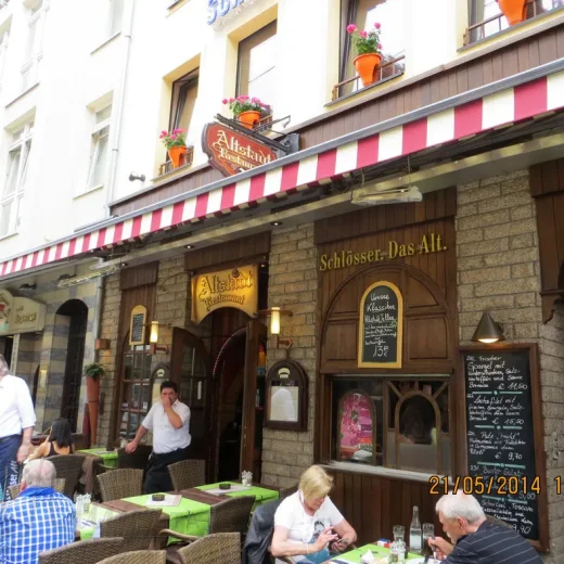 Улица короткая, всего один квартал, но пройти её не просто. Она практически на всем протяжении заставлена столиками, за которыми наливают фирменное для Дюссельдорфа и весьма оригинальное пиво «Альт (Altbier)».