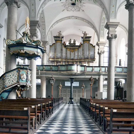 В момент строительства церковь представляла собой простое, вытянутое, шестипролетное здание, но оно просуществовало недолго. Здание обветшало из-за проседания грунта и между 1735 и 1737 годами была построена трехнефная кирпичная церковь в нынешнем виде.