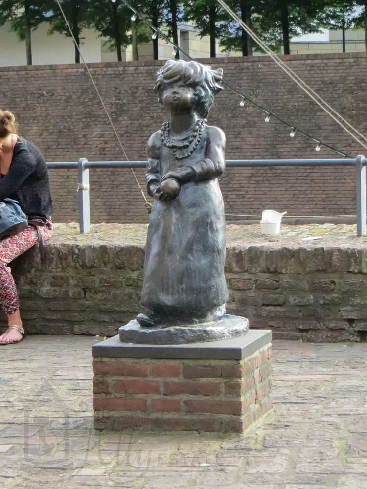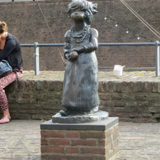 На территории Старого порта в кадр попала маленькая бронзовая фигурка пухлой девочки с растрепанными волосами, поднятой головой, несущую в руках небольшой мячик. На девочке платье длиной до щиколотки с длинными рукавами и несколько ярких ожерелий.