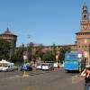 От площади Кайроли в сторону замка идем по улице Via Luca Beltrami. Эта короткая и широкая улица, фактически площадь, отдана для маневров и парковки многочисленных туристических автобусов, подъезжающих к замку Сфорца.