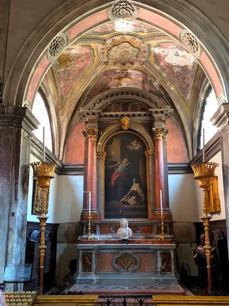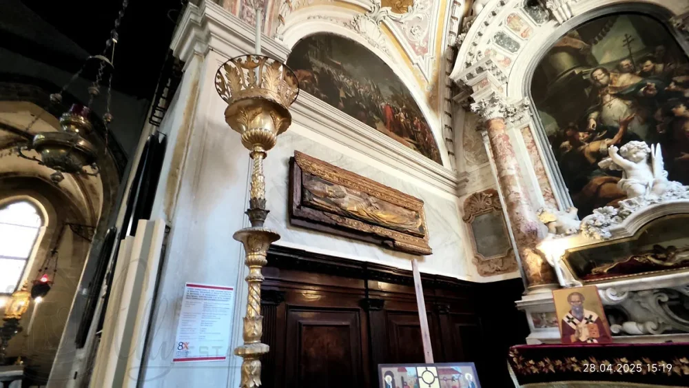 В левом нефе, в нише, расположена купель, состоящая из нескольких частей, относящихся к разным эпохам. Самая старая, может быть датирована 1430 годом и представляет собой восьмиугольную чашу из красного веронского мрамора.