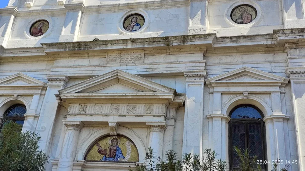 Над главным входом в церковь в люнете находится мозаика с изображением Спасителя. В трёх овалах поверху фасада размещена еще одна мозаика Спасителя, а также Богоматерь и Иоанн Креститель.