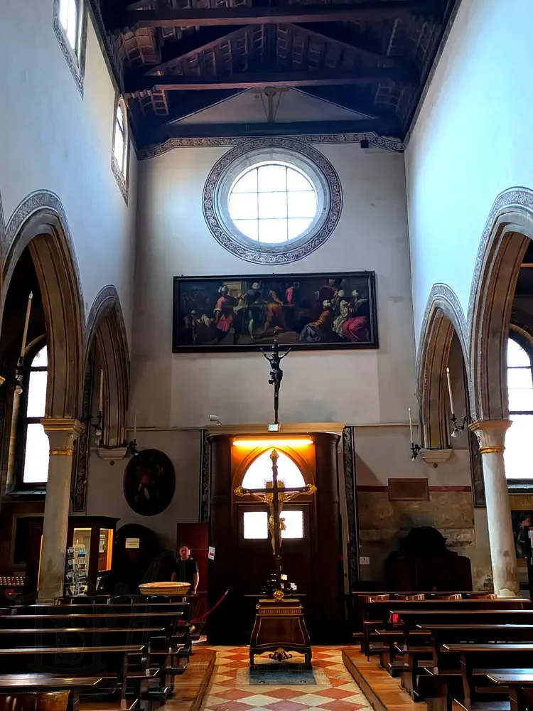Два ряда колон из истрийского камня с квадратным основанием делят пространство на три нефа и поддерживают остроконечные арки, на которых установлен изящный сводчатый потолок.