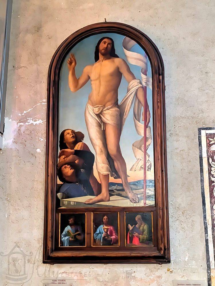 По обеим сторонам хор поддерживался двумя алтарями Святых Даров (слева от главного алтаря) с «Воскресшим Христом» работы Альвизе Виварини и Креста (справа) со святыми Еленой и Константином работы Чима де Конельяно