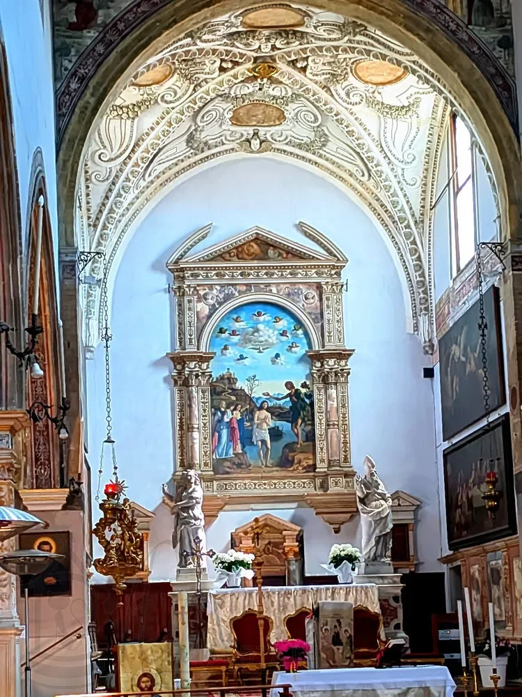 Несмотря на изменения на протяжении веков, пресвитерий, в котором доминирует алтарь «Крещение Христа» Чима де Конельяно, один из старейших сохранившихся алтарных образов и архитектурная гордость церкви.