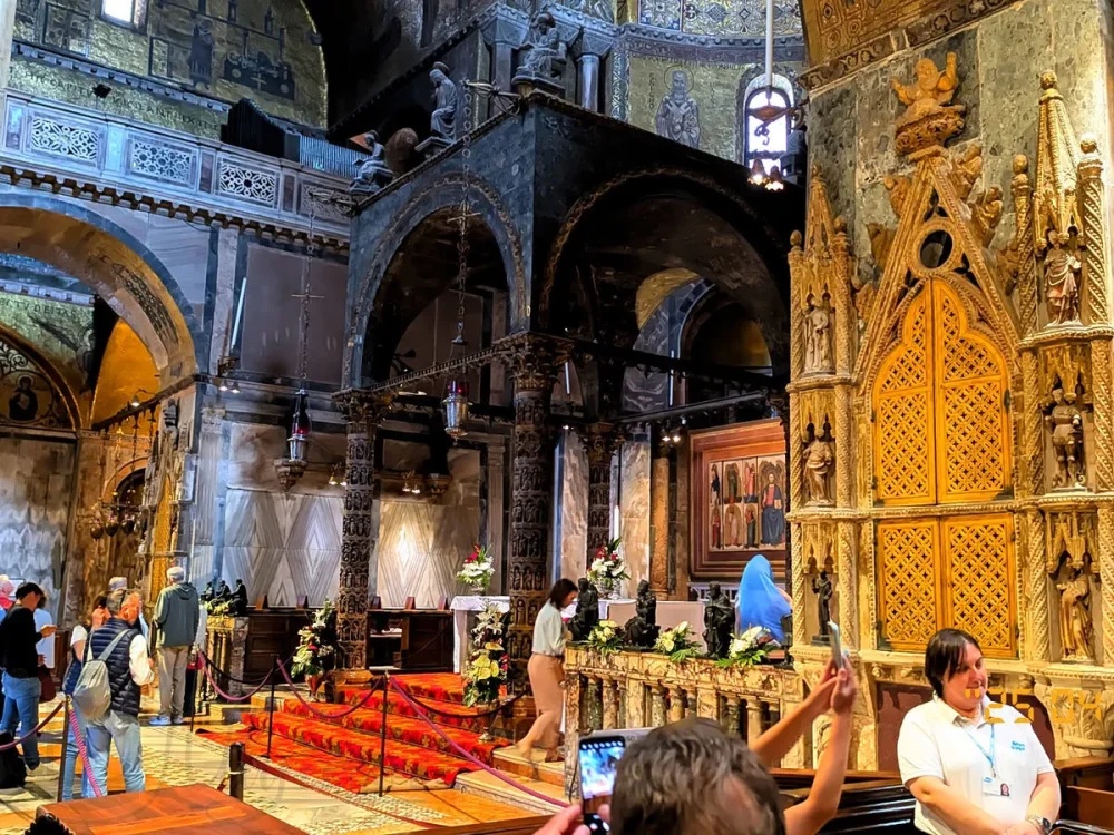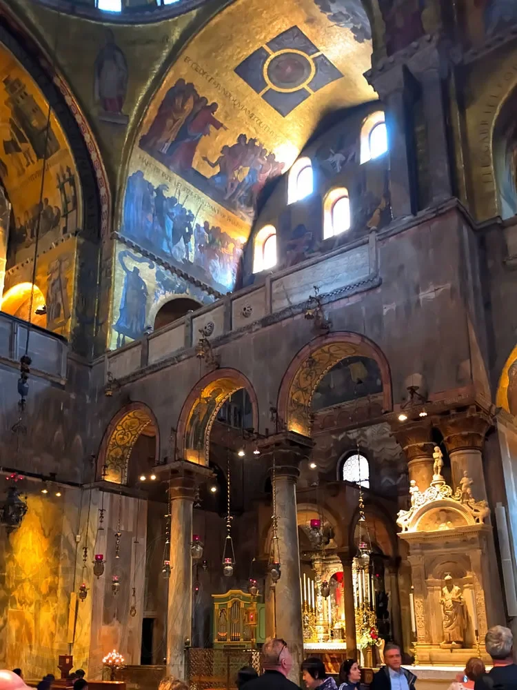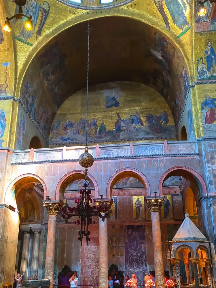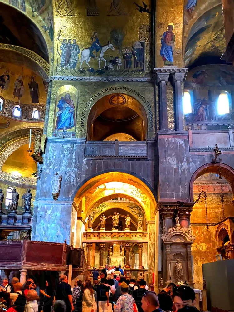 В статье о главном венецианском соборе – Базилике Сан Марко. Побываем внутри, полюбуемся на километры золотой мозаики на стенах и куполах, а также на золотой алтарь Пало де Оро и античных лошадок в музее на верху.