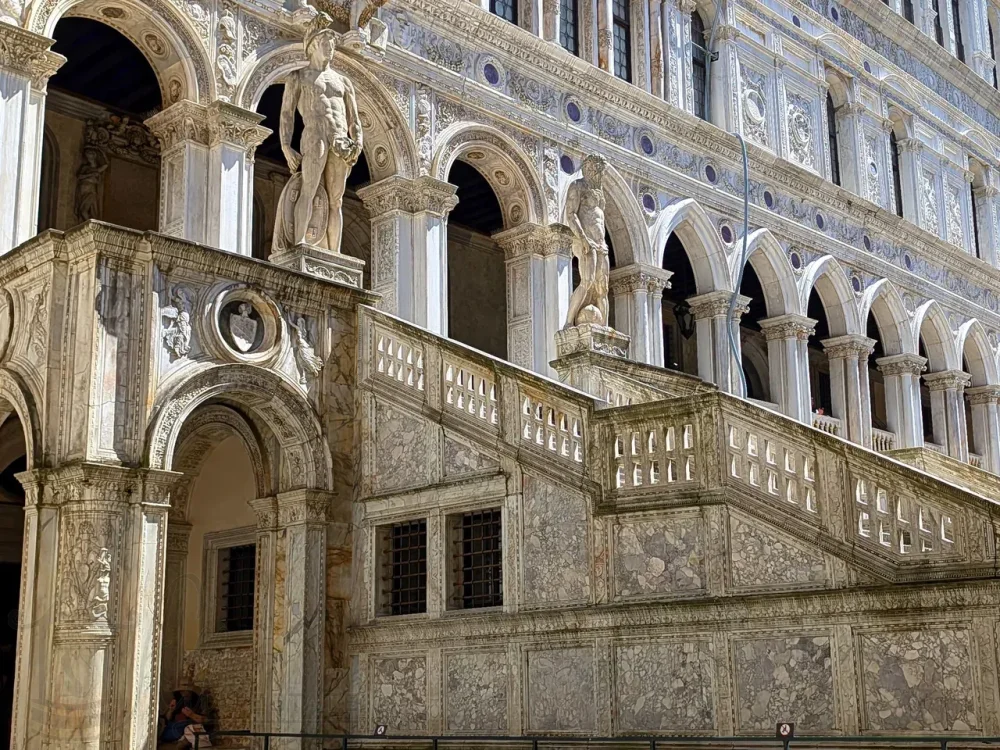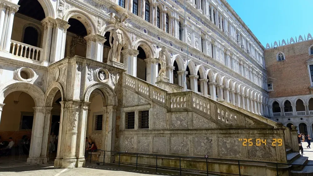 Самое внушительное и ценное сооружение во внутреннем дворе Дворца Дожей Венеции это конечно Лестница Гигантов в стиле эпохи Возрождения. Она расположена левее от места нашего входа и ведет ко второму уровню противоположного восточного крыла дворца, туда, где его опоясывают лоджии.