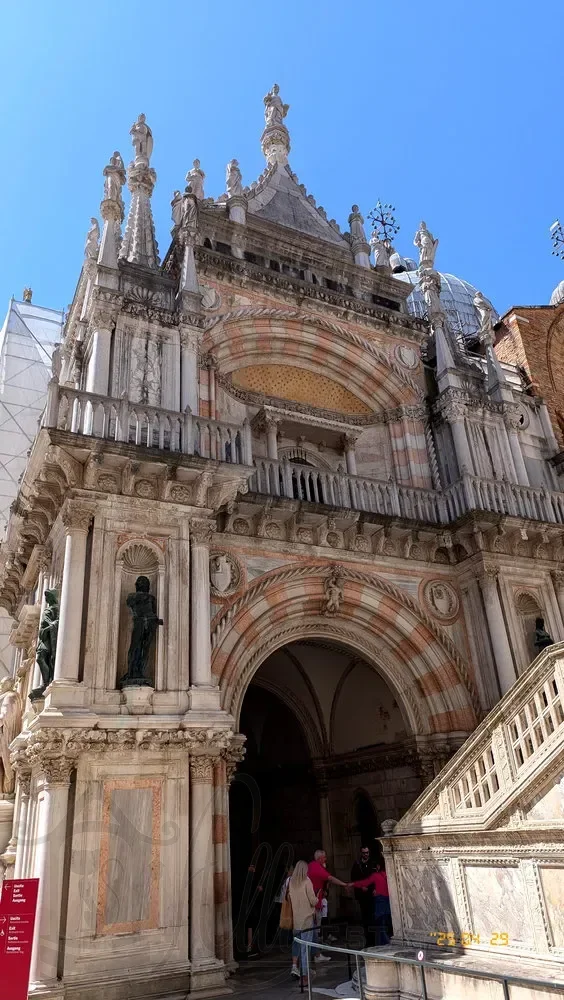 Интересно, что оформление ворот, на мой взгляд, даже более интересно со стороны двора, где у архитекторов было больше возможностей. При всей красоте обрамления портал снаружи гораздо меньшего размера, так как ворота зажаты между стенами зданий Собора Сан Марко и Дворца Дожей.