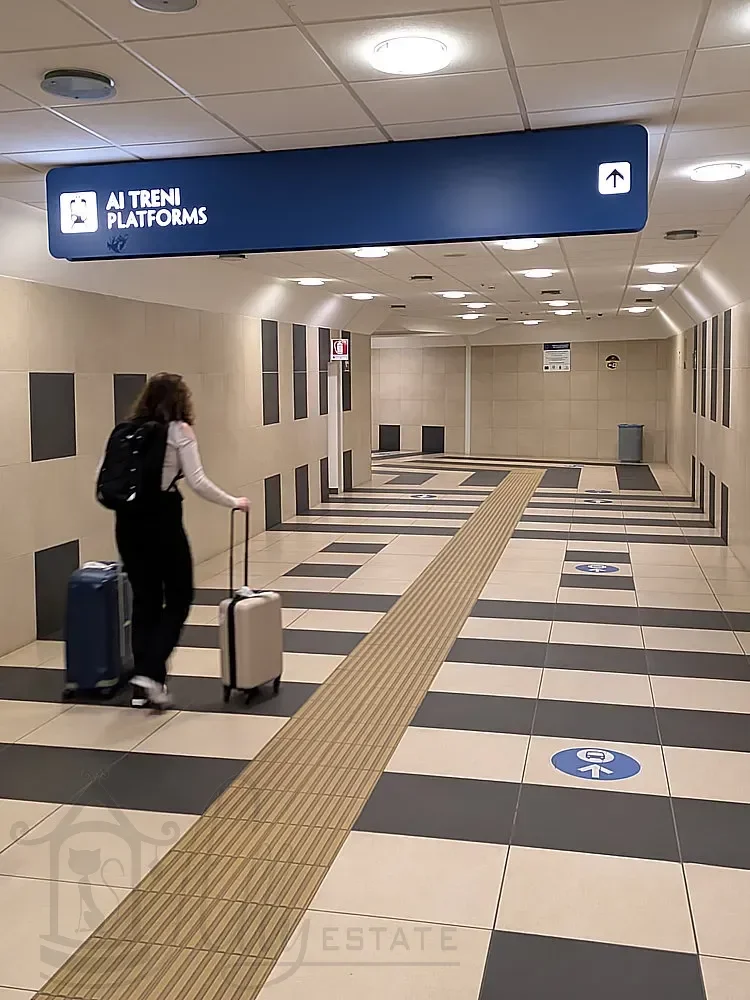 Железнодорожная станция аэропорта Бари расположена отдельно от терминала. Выйдя из зоны прилёта нужно повернуть налево и выйти из здания терминала через выход обозначенный как ж.д.станция.