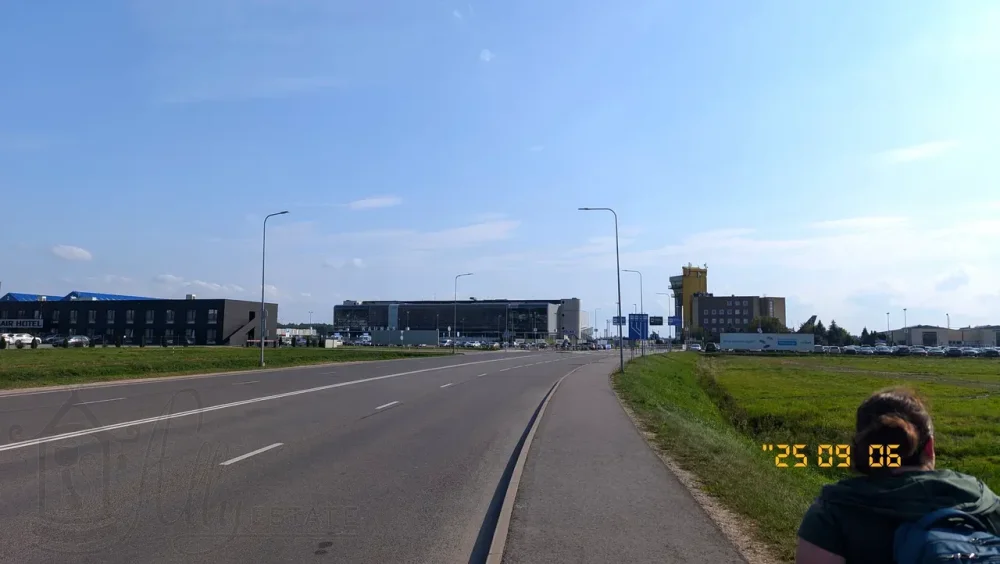 От парковки до входа в терминал аэропорта Каунаса примерно 10-12 минут неспешного хода. Мы пошли по улице Pievų асфальт хороший и чемодан бодро катился на колесиках.