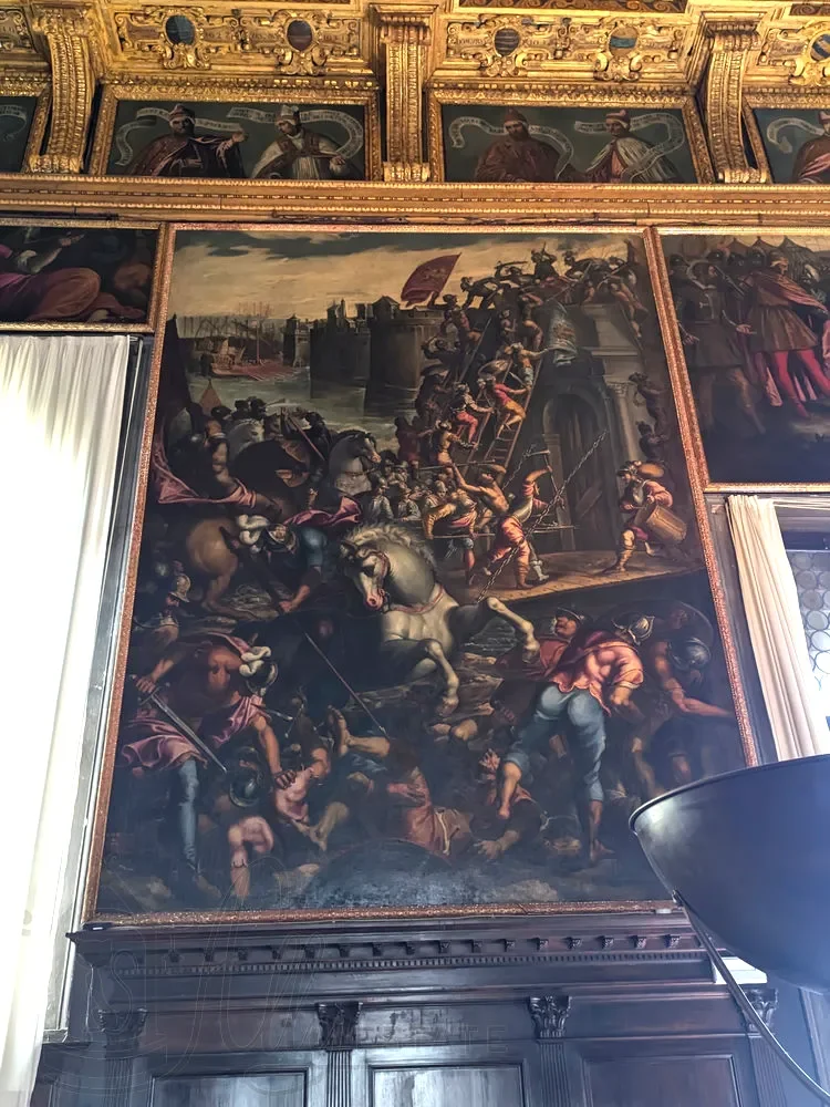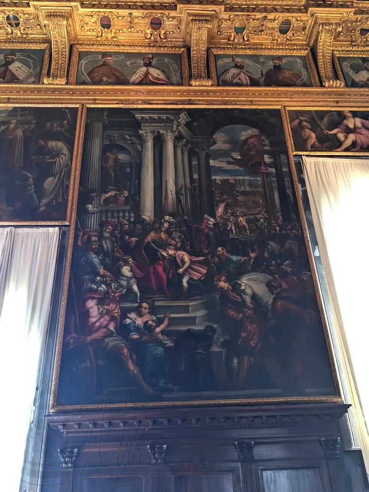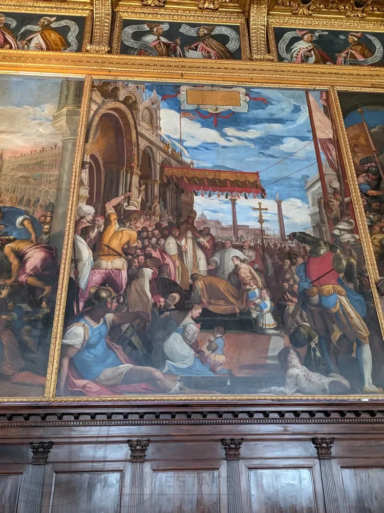 Статья полностью посвящена картинам, размещенным на стенах и потолке Зал Большого совета Дворца Дожей Венеции. Среди авторов Тинторетто, Веронезе, Пальма Младший, Доменико Робусти, Леандро Бассано и другие.