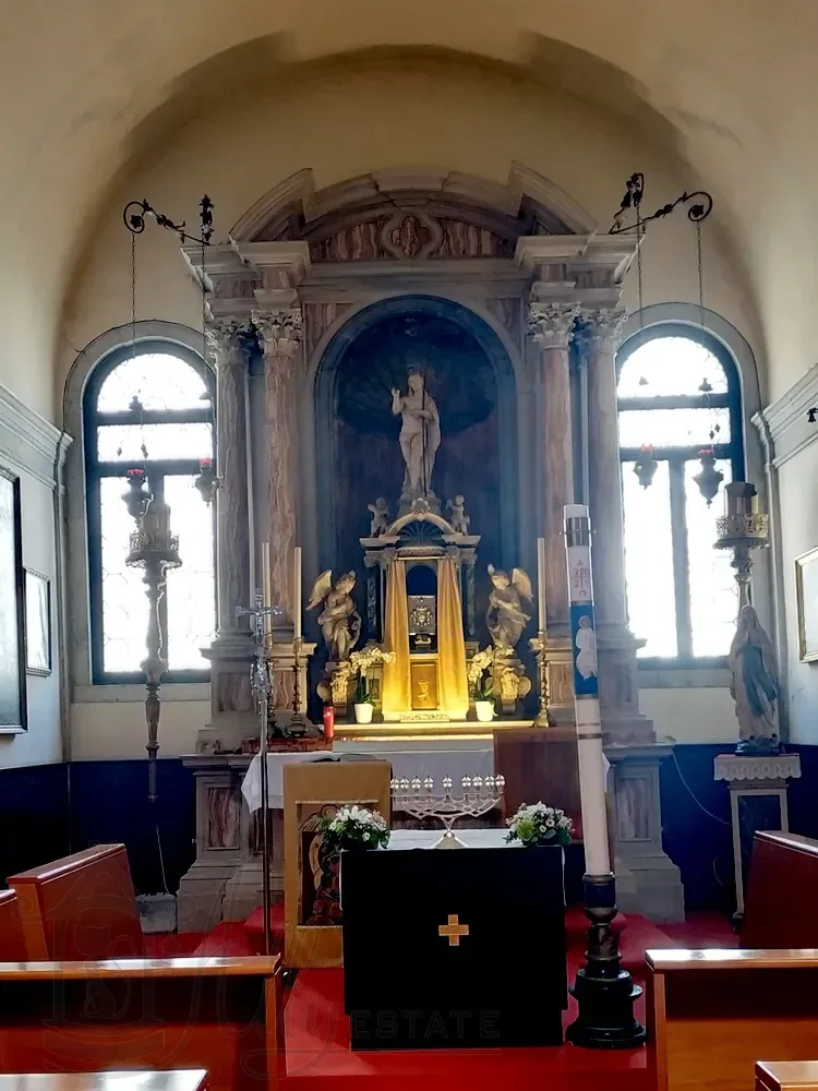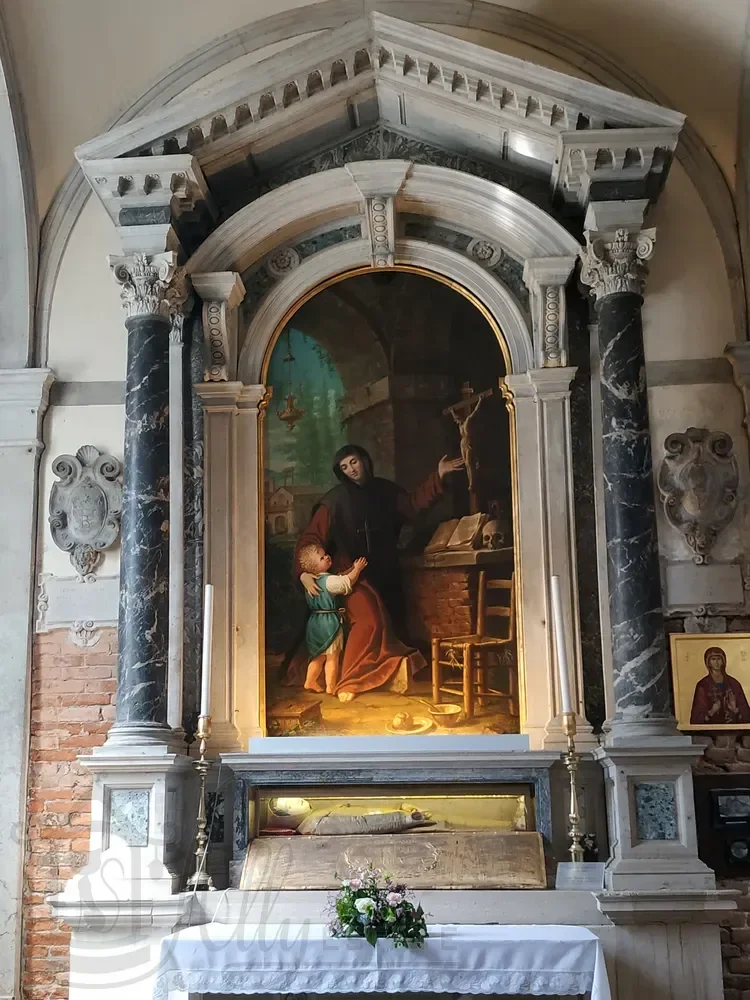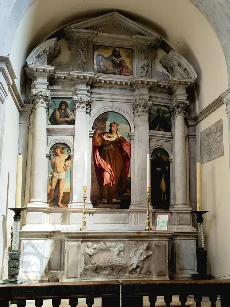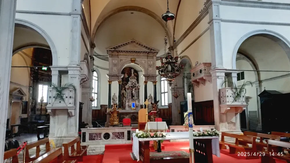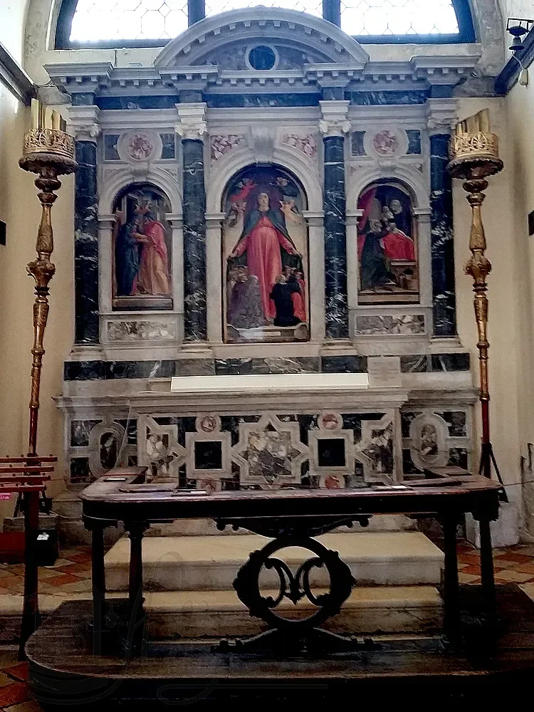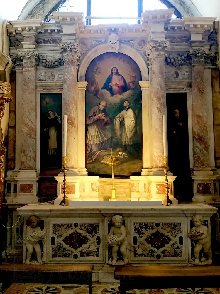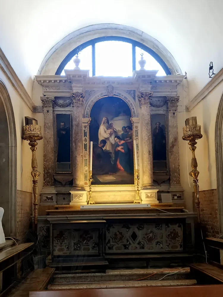 Справа в средокрестии отдельно стоящий арочный алтарь, а на изогнутой стене позади него — алтарная картина Джованни Сегала (Giovanni Segala, 1663–1720 гг.), изображающая «Представление дожу невест, освобожденных после похищения пиратами».