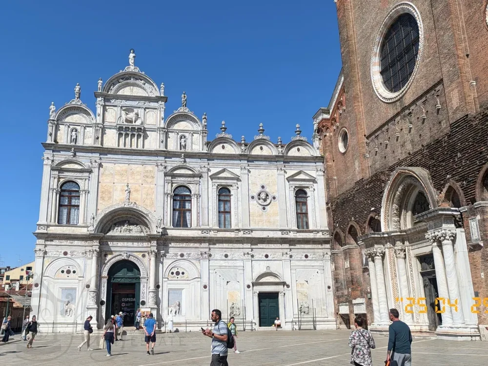 Вплотную к зданию Базилики Санти-Джованни-э-Паоло примыкает фасад здания Скуолы Гранде ди Сан-Марко.