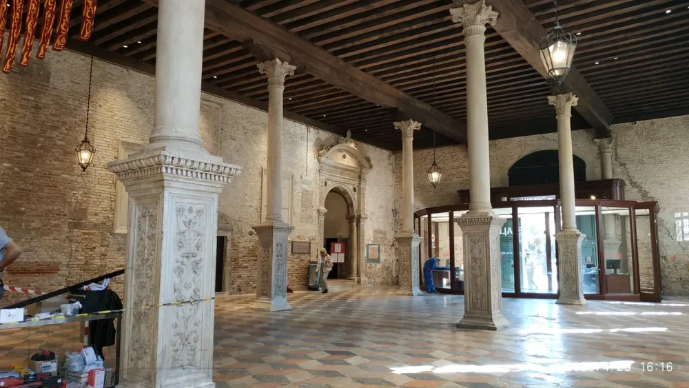 Во внутренних же помещениях только голые стены и проход в большую гражданскую больницу Санти-Джованни-э-Паоло. Войдя через главную дверь, попадаем в «Портего делле Колонне» - обширное помещение на первом уровне. Оно разделено на три части двойным рядом коринфских колонн, опирающихся на высокие каменные основания из истрийского камня.